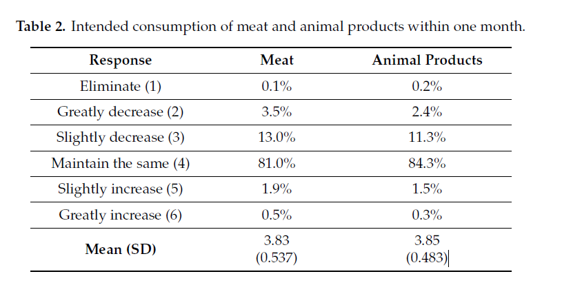 除此之外,即便他們知道素食對環保與人道有所貢獻,但這不足以說服他們吃素,下面的表格顯示80~84%的人在未來一個月沒有想要改變現在的飲食型態,11~13%的人願意稍為減少動物性食物的攝取,最後有只有2~3%的人願意大幅度減少動物性食物的攝取。