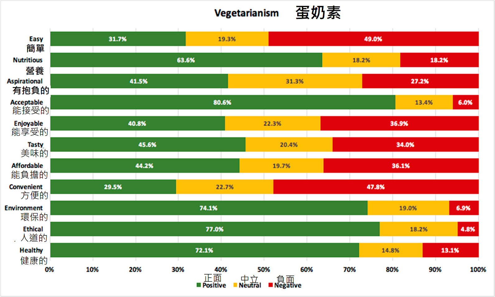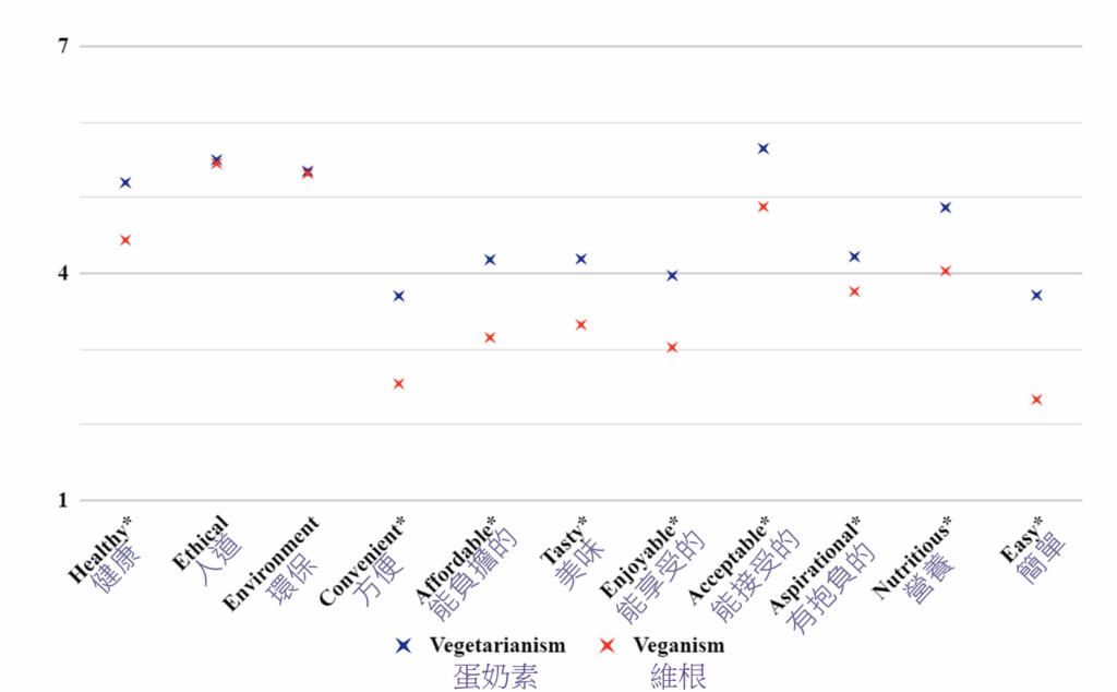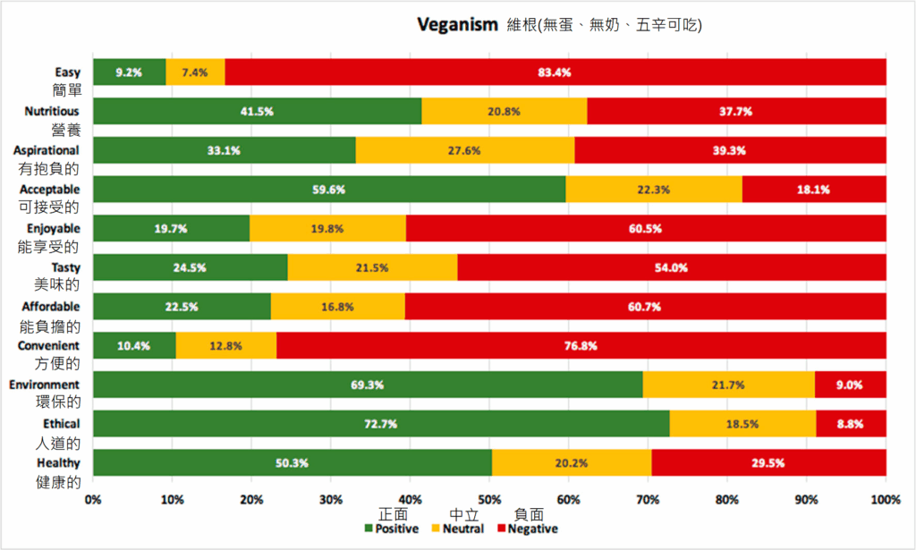 從上述的三個圖表可發現,吃肉的民眾認為蛋奶素與維根在可行性上是有差異的,他們普遍對蛋奶素的接受度較高,也認為蛋奶素較方便、較便宜、較好吃、較營養。有趣的是,在人道與環保方面,這兩種飲食得到的分數一樣高,也就是說肉食者並不認為維根比蛋奶素更環保、對動物更人道。