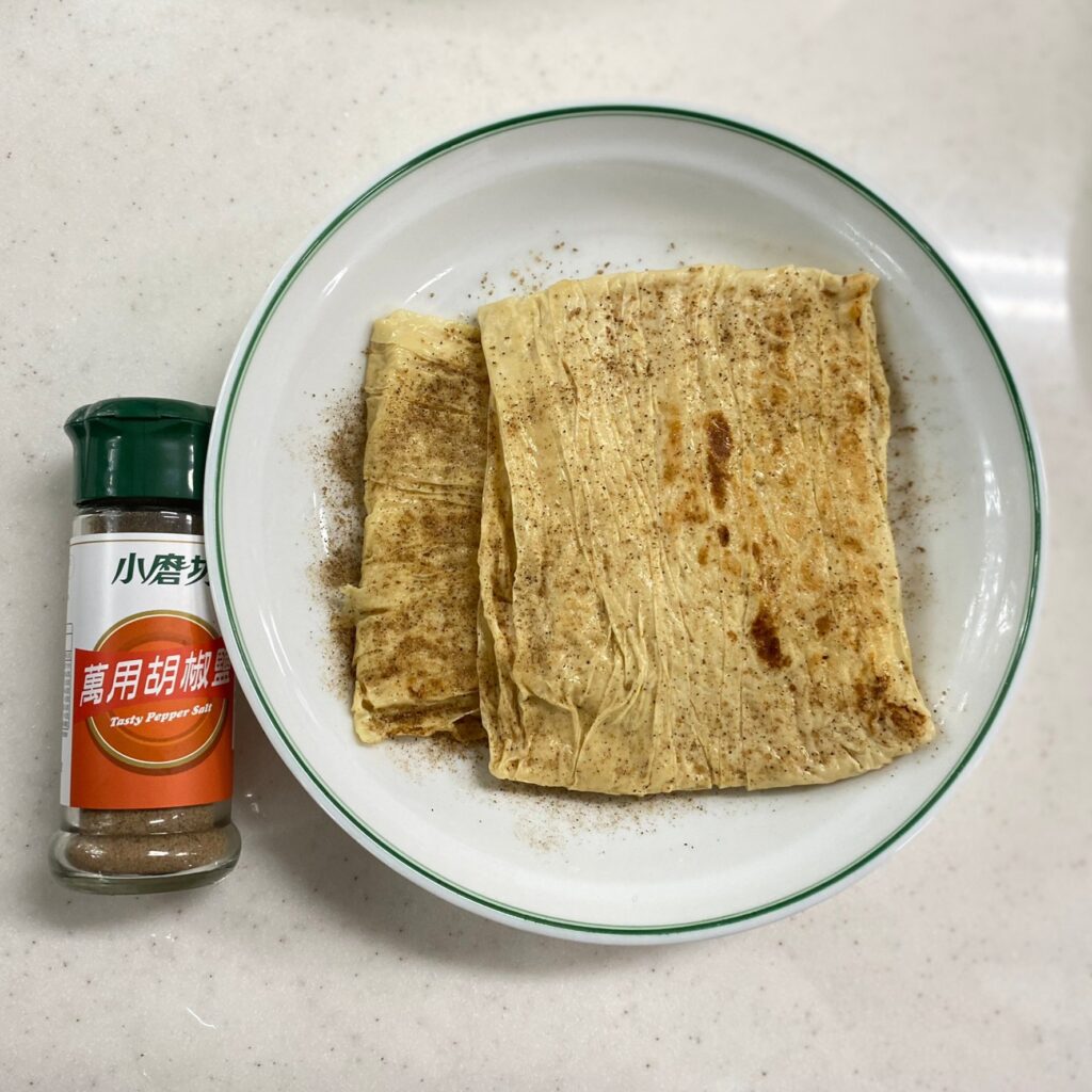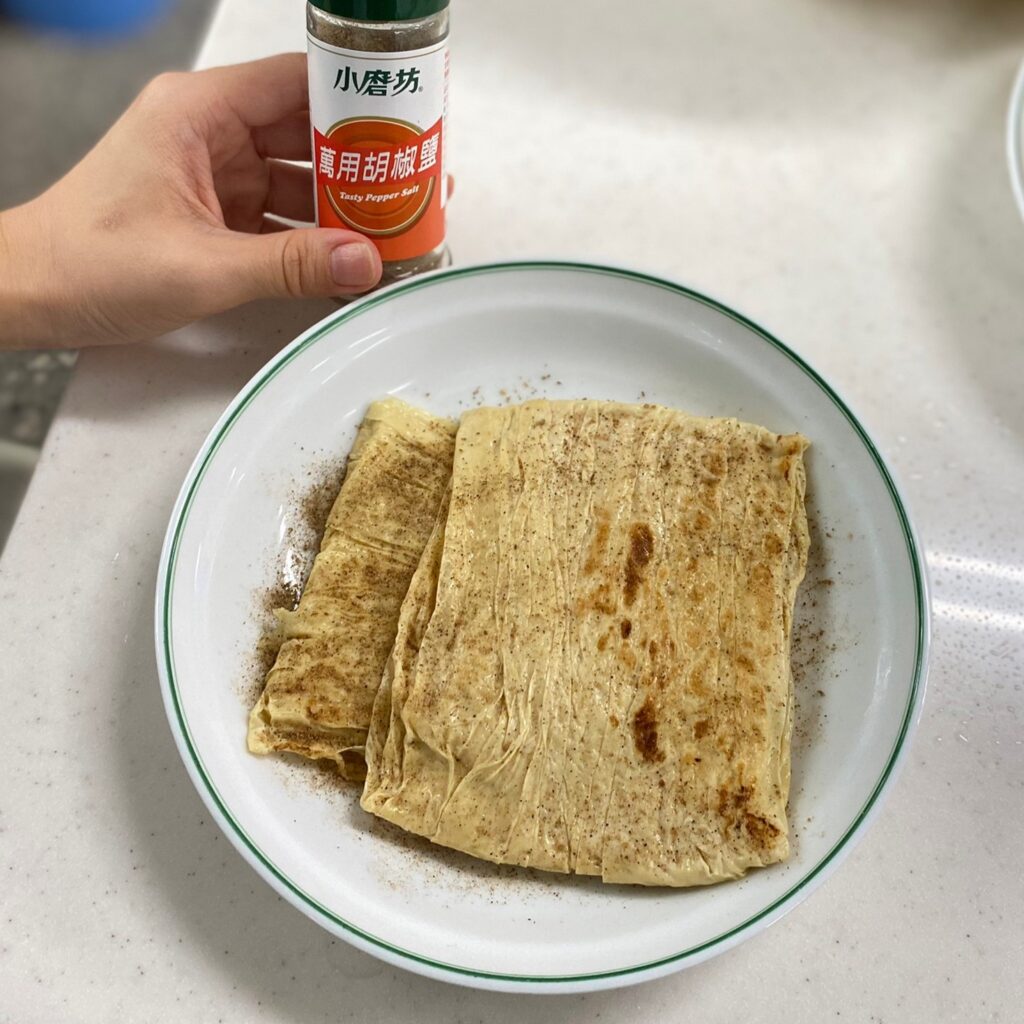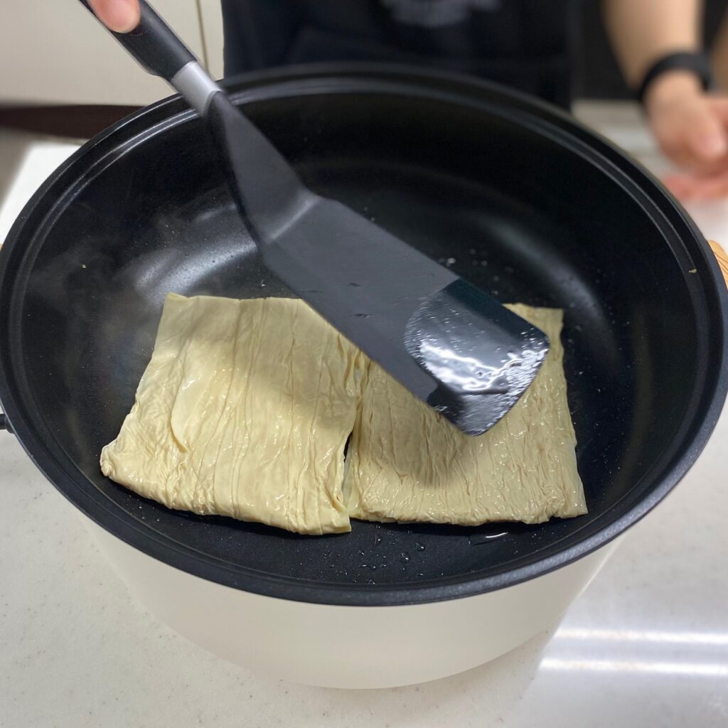 如果喜歡吃外表酥酥脆脆的豆包,先把豆包展開來 (通常豆包會被折兩次,展開來會變得比較長),再下鍋,這樣可以加速豆包加熱的速度,也可以將豆包煎得比較酥脆。
