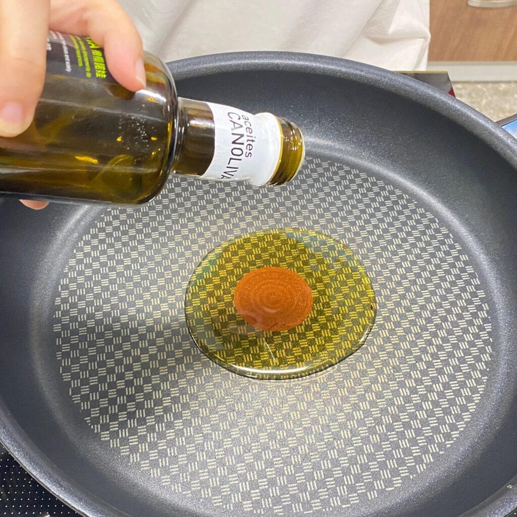 倒入3~4茶匙的橄欖油,以中火熱油