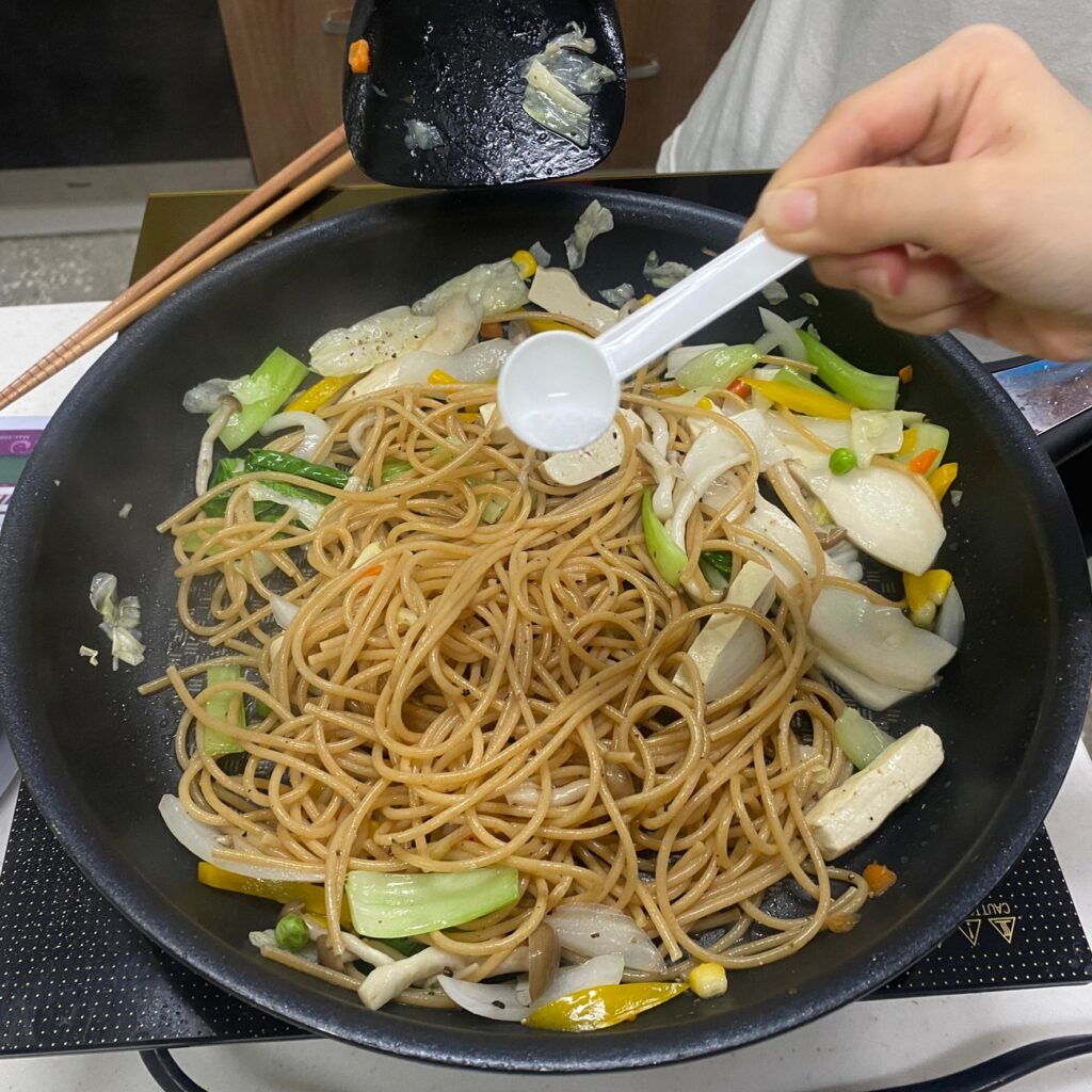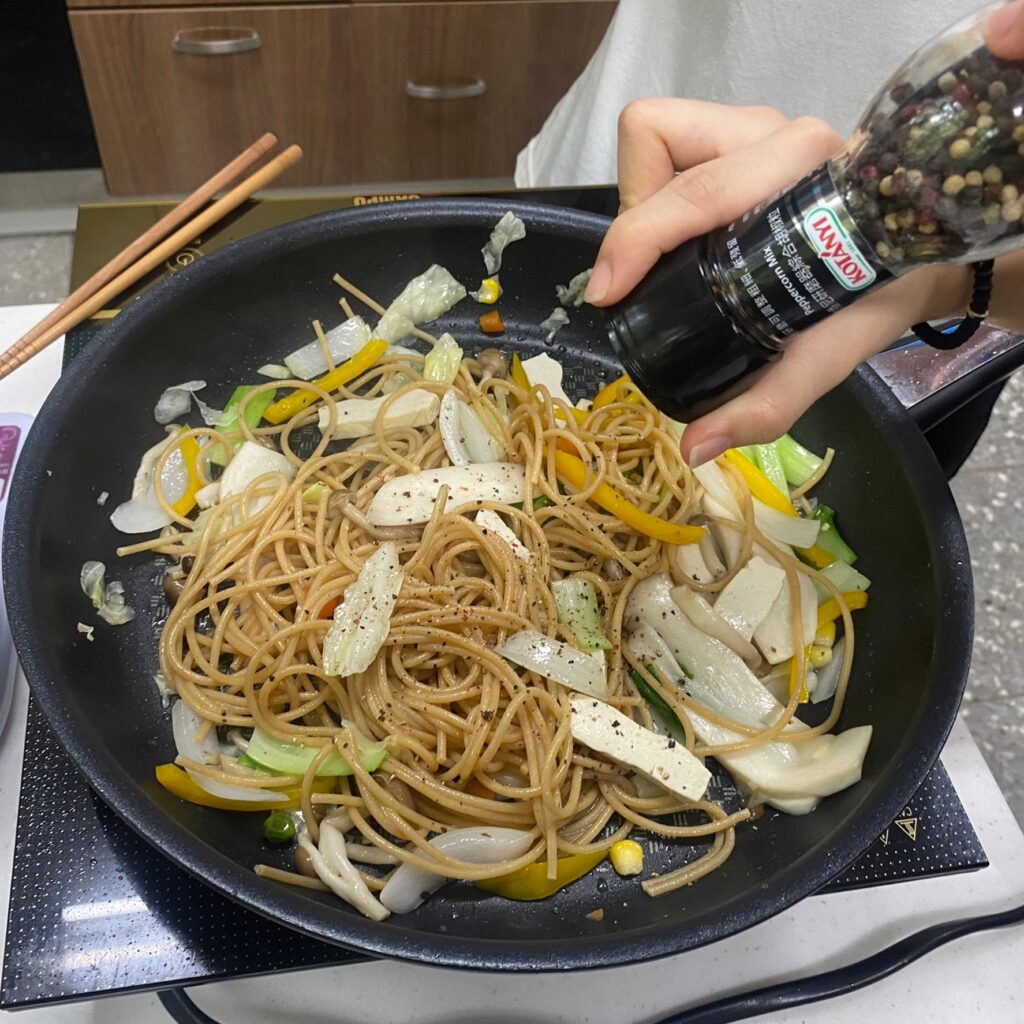 熟義大利麵條下鍋拌炒撒上黑胡椒與義大利香料 (依個人喜好調整)
