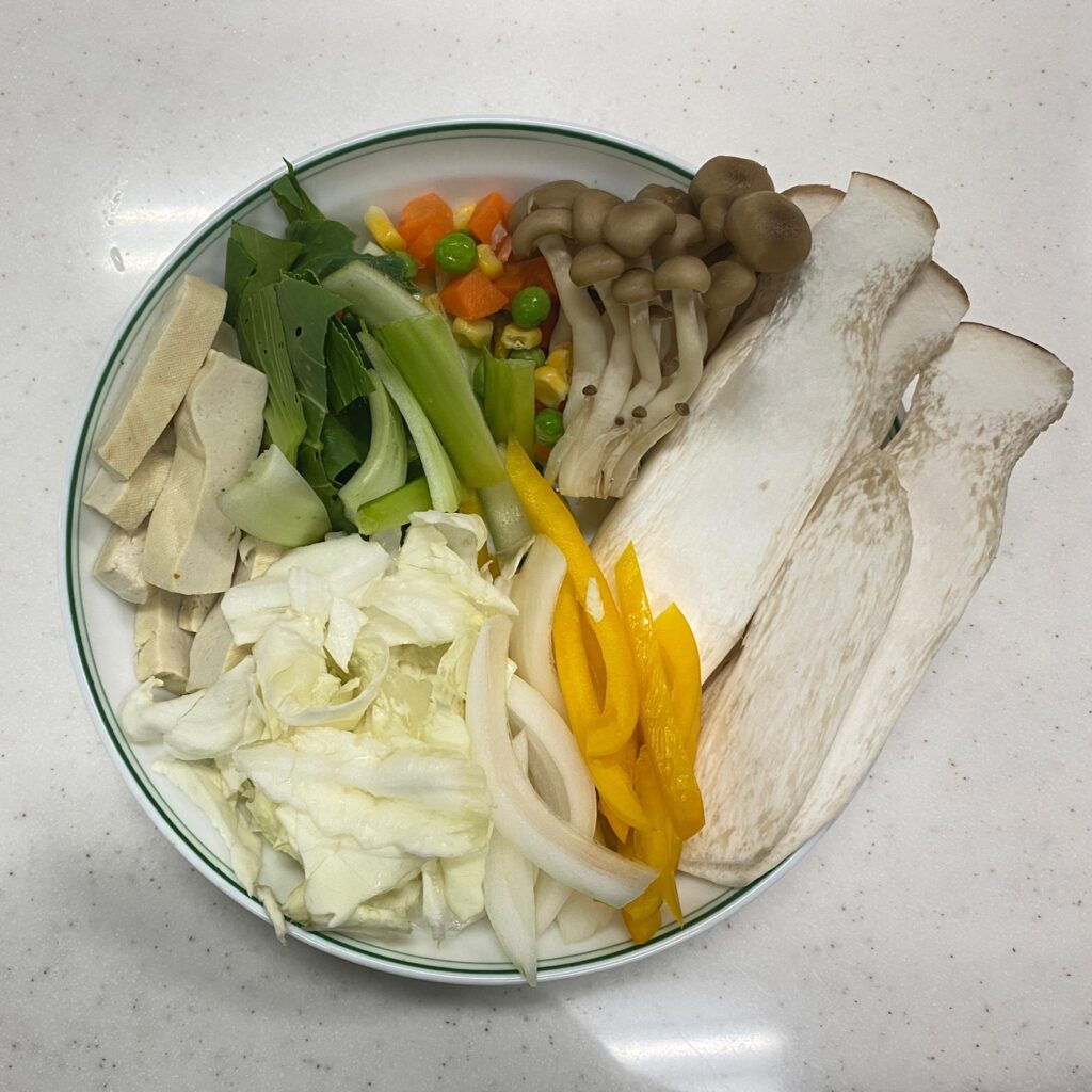 2匙綜合蔬菜(豌豆、紅蘿蔔丁、玉米粒),或用冷凍毛豆代替
