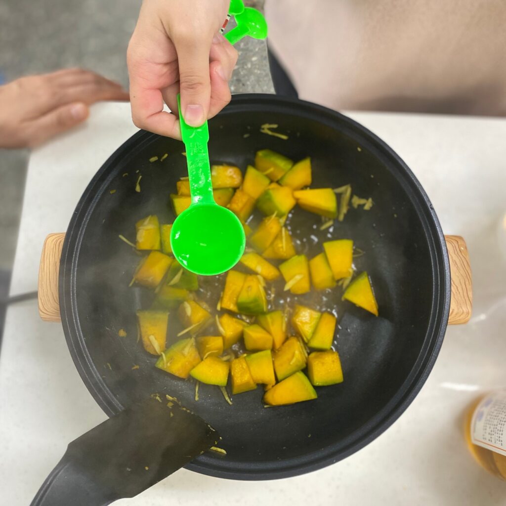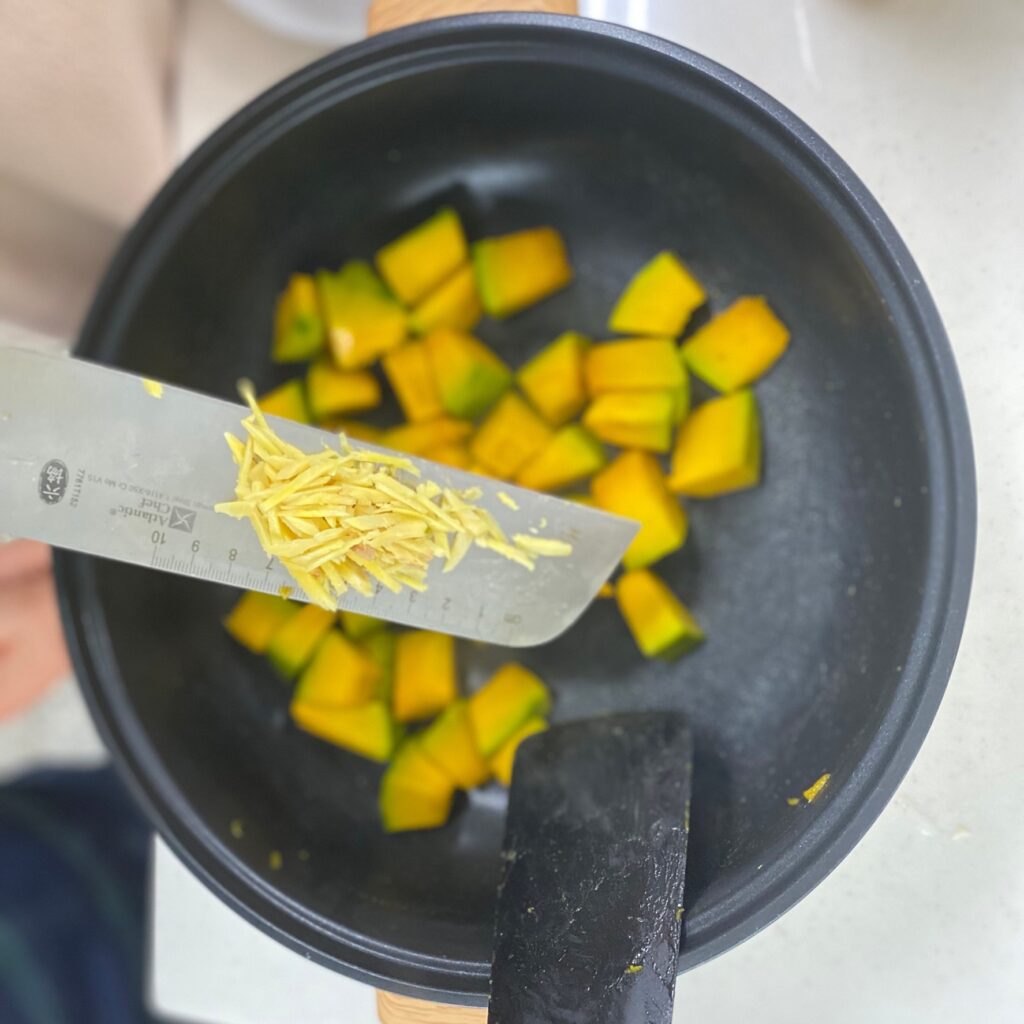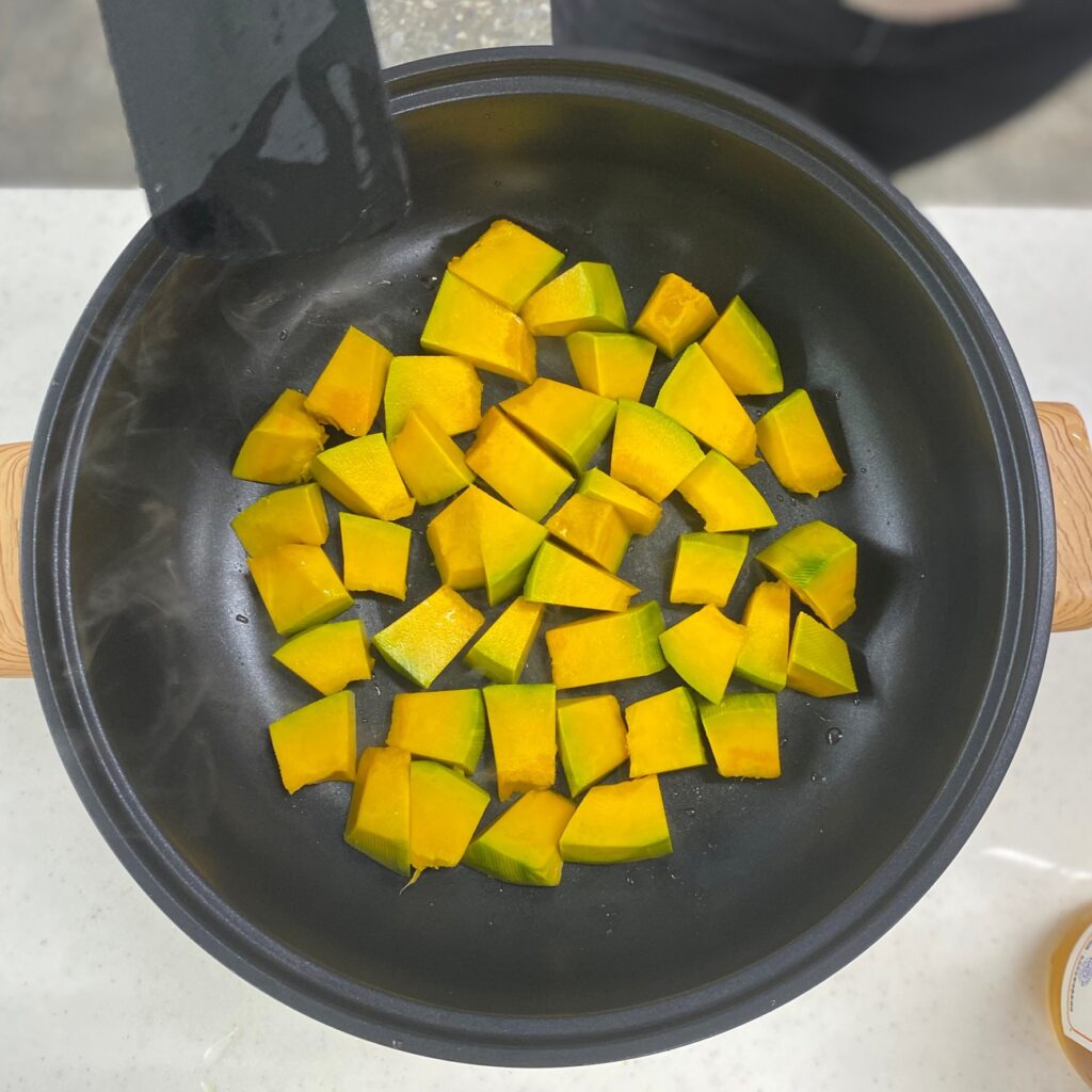 以中小火拌炒南瓜, 2~3分鐘