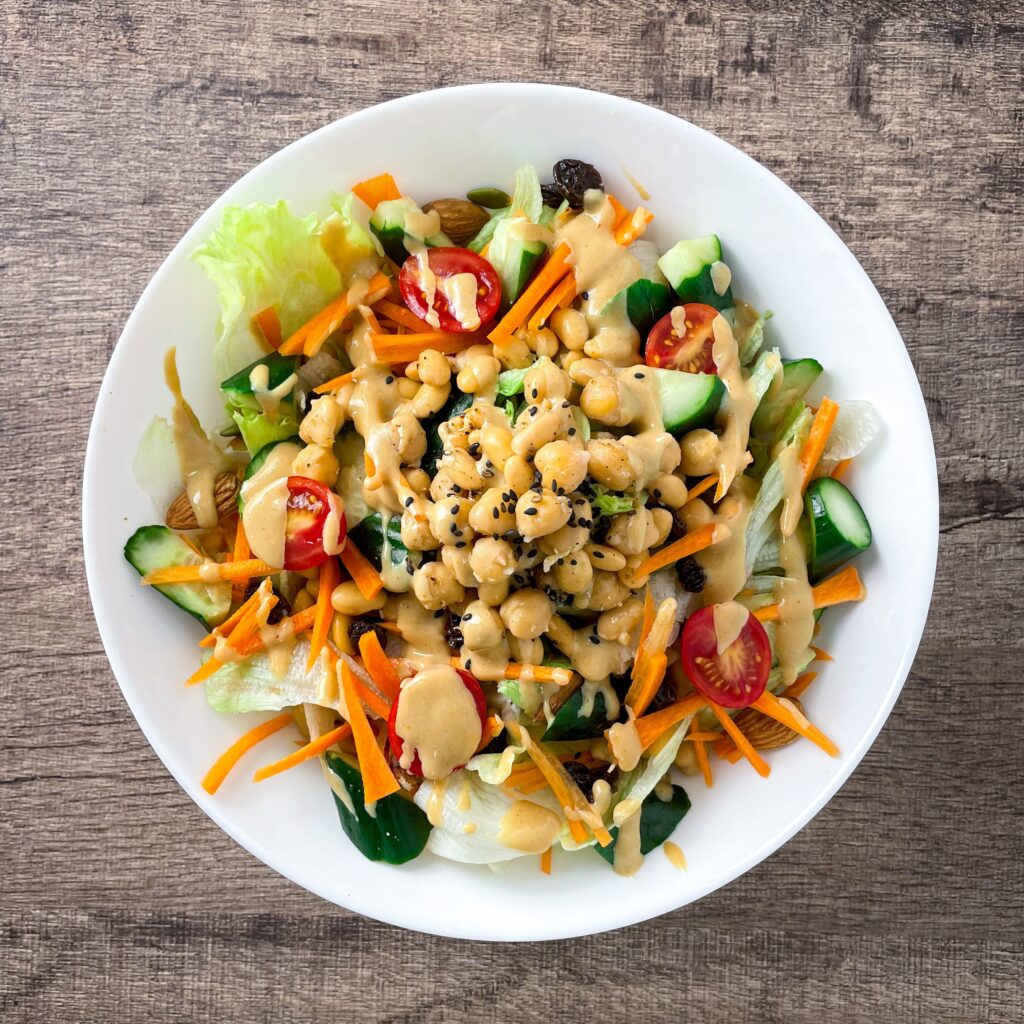 將所有新鮮食材洗淨,瀝乾,放入大碗中,再撒上鷹嘴豆,備用