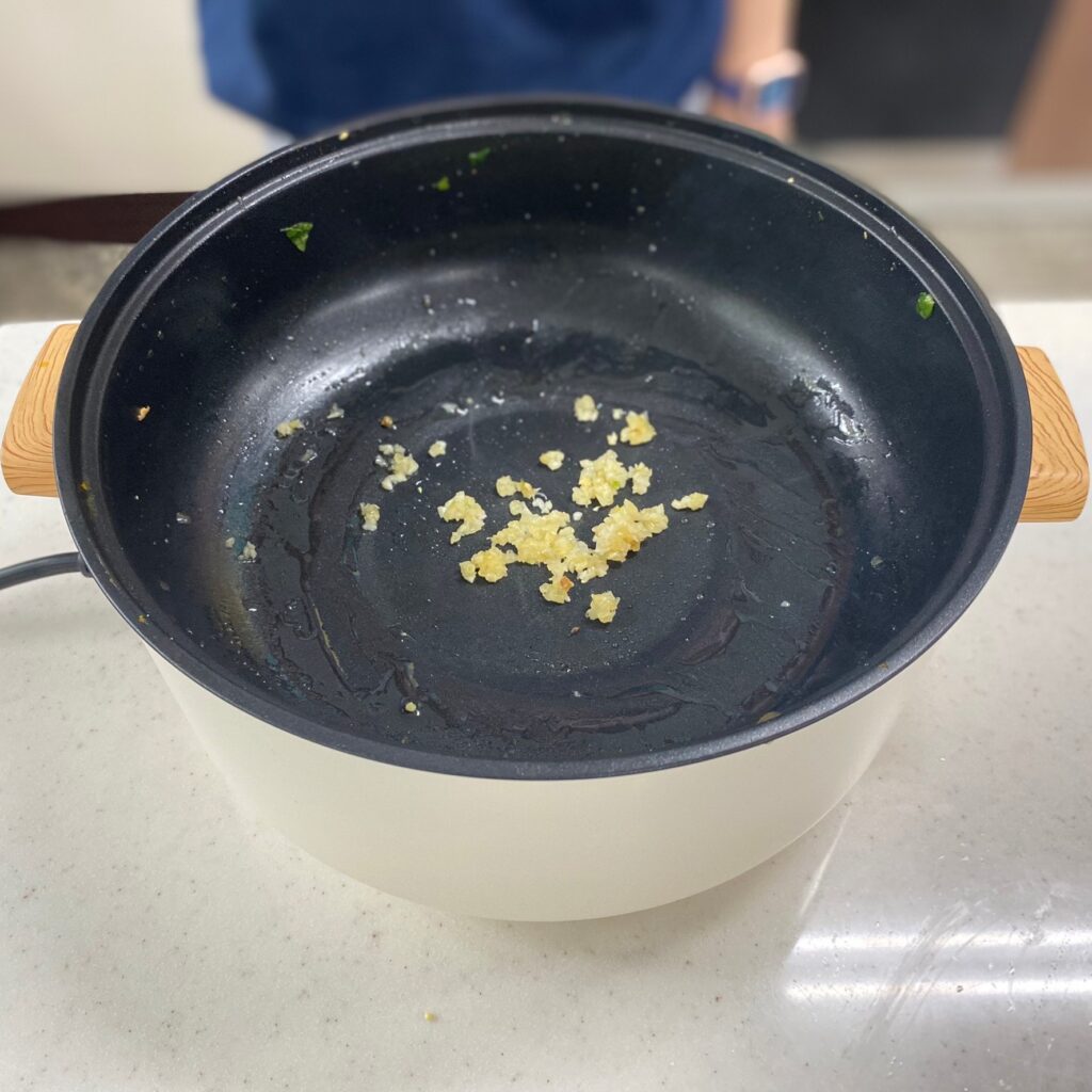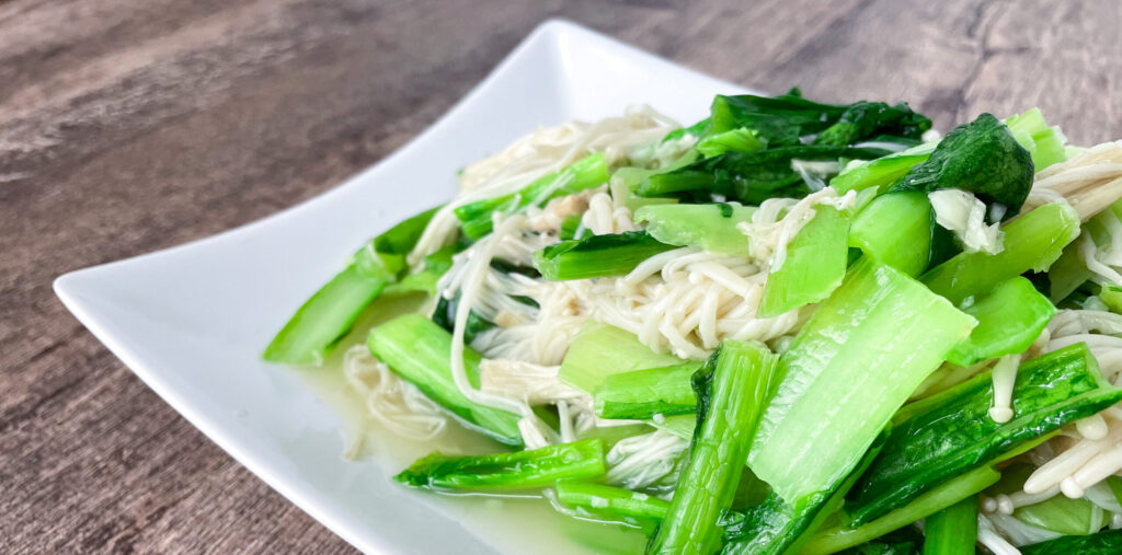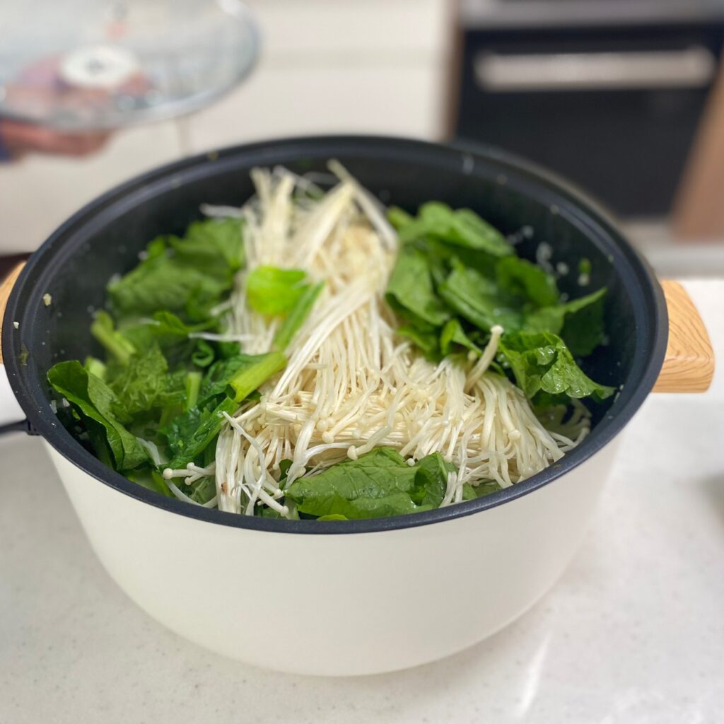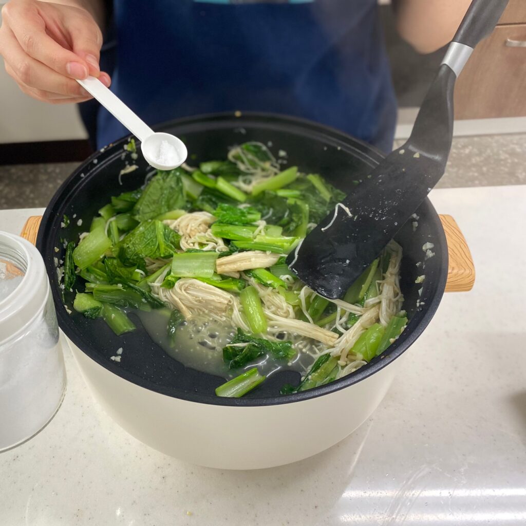 青菜洗洗切切、金針菇剝散、蒜頭切成蒜末