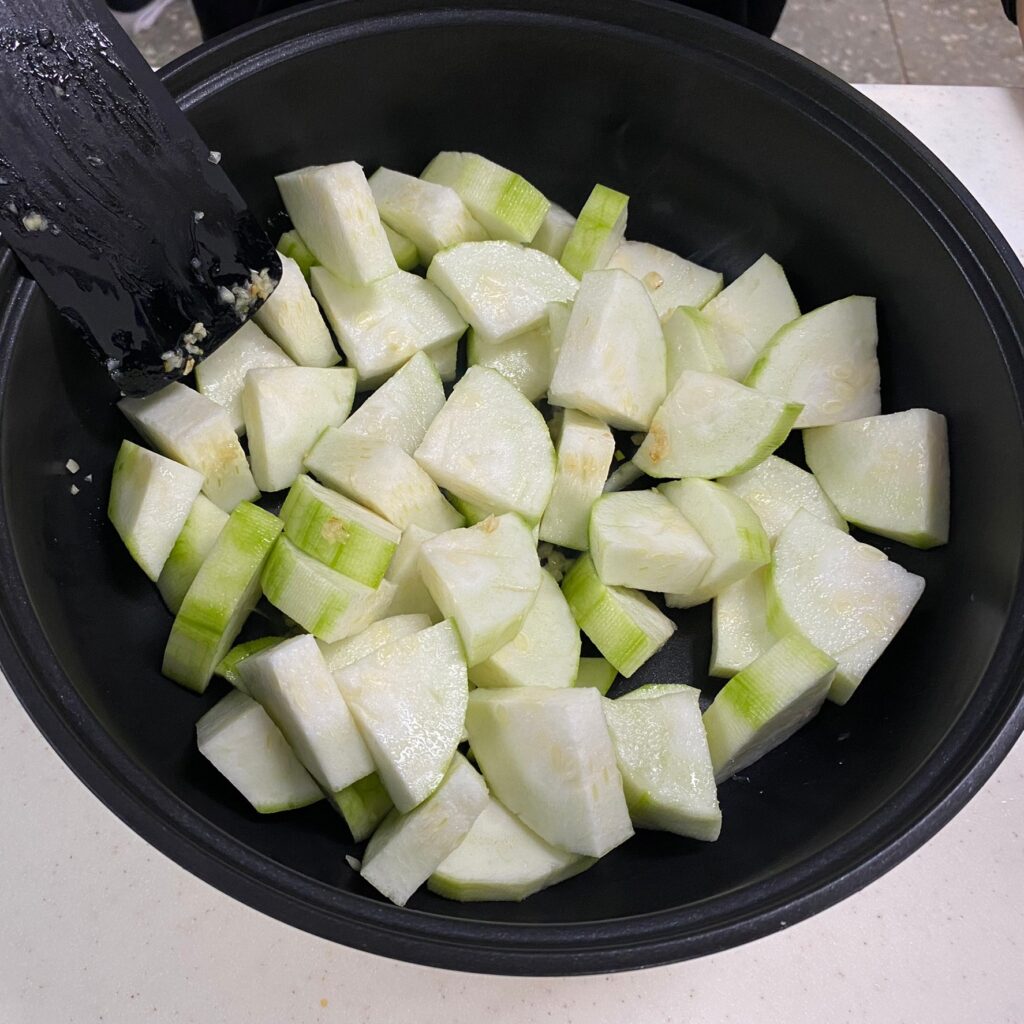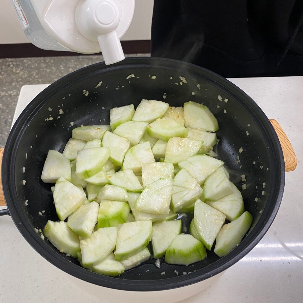 加3~5匙水 (不要加太多,因為絲瓜煮熟後也會滲出水分)