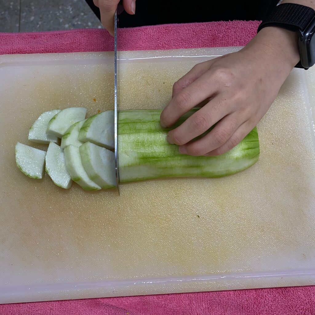 削皮後絲瓜剖半,切片