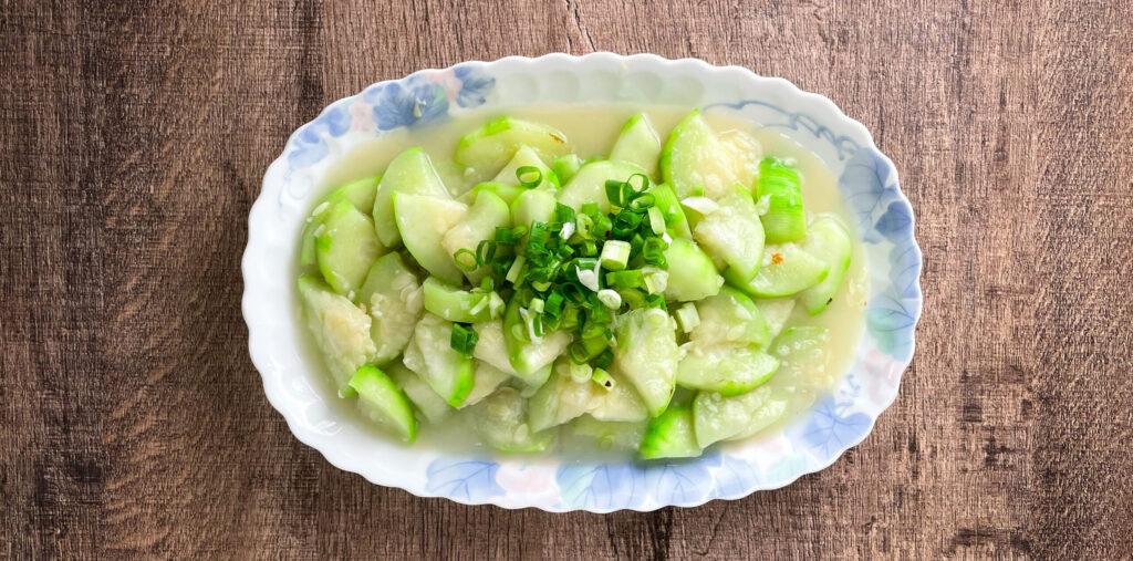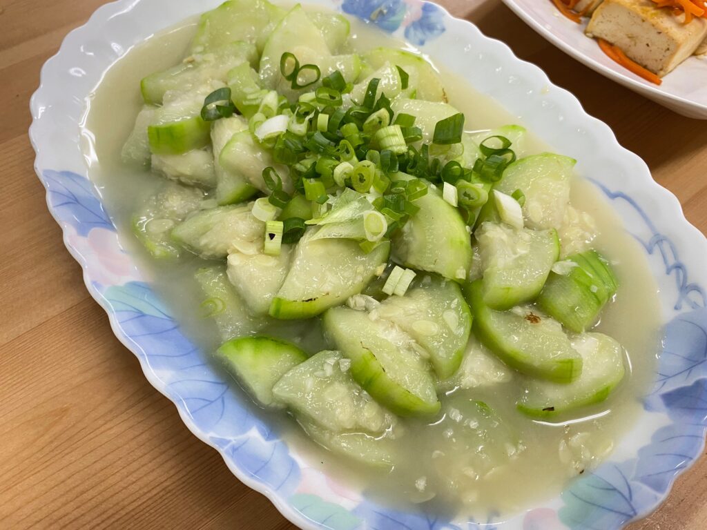 絲瓜悶軟熟了、打開鍋蓋撒下蔥末,加一些鹽調味,完成