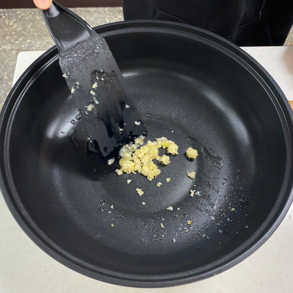 加入一茶匙的油,以中火加熱,加入薑絲或是蒜末炒香