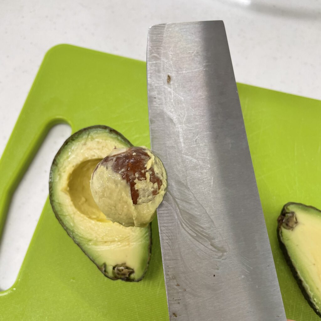 將刀子快速的揮進酪梨籽,卡在酪梨籽裡