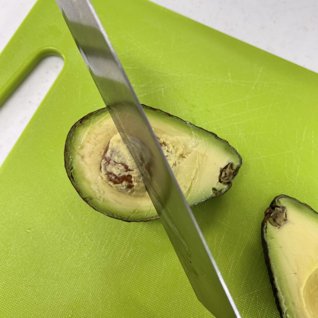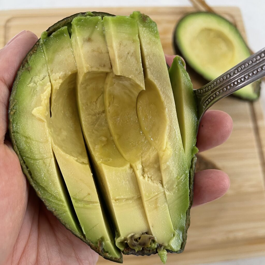 用刀子將一半的酪梨劃成條狀