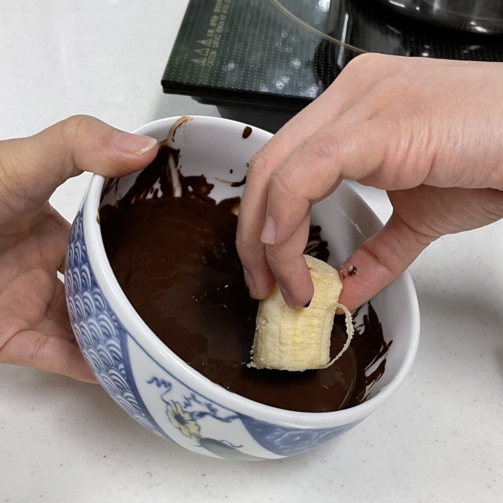 重複步驟,直到所有香蕉都沾取到巧克力醬