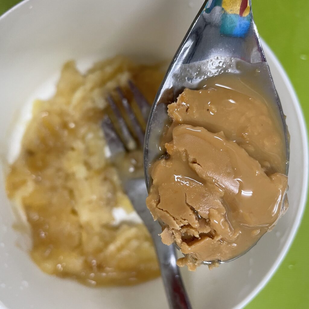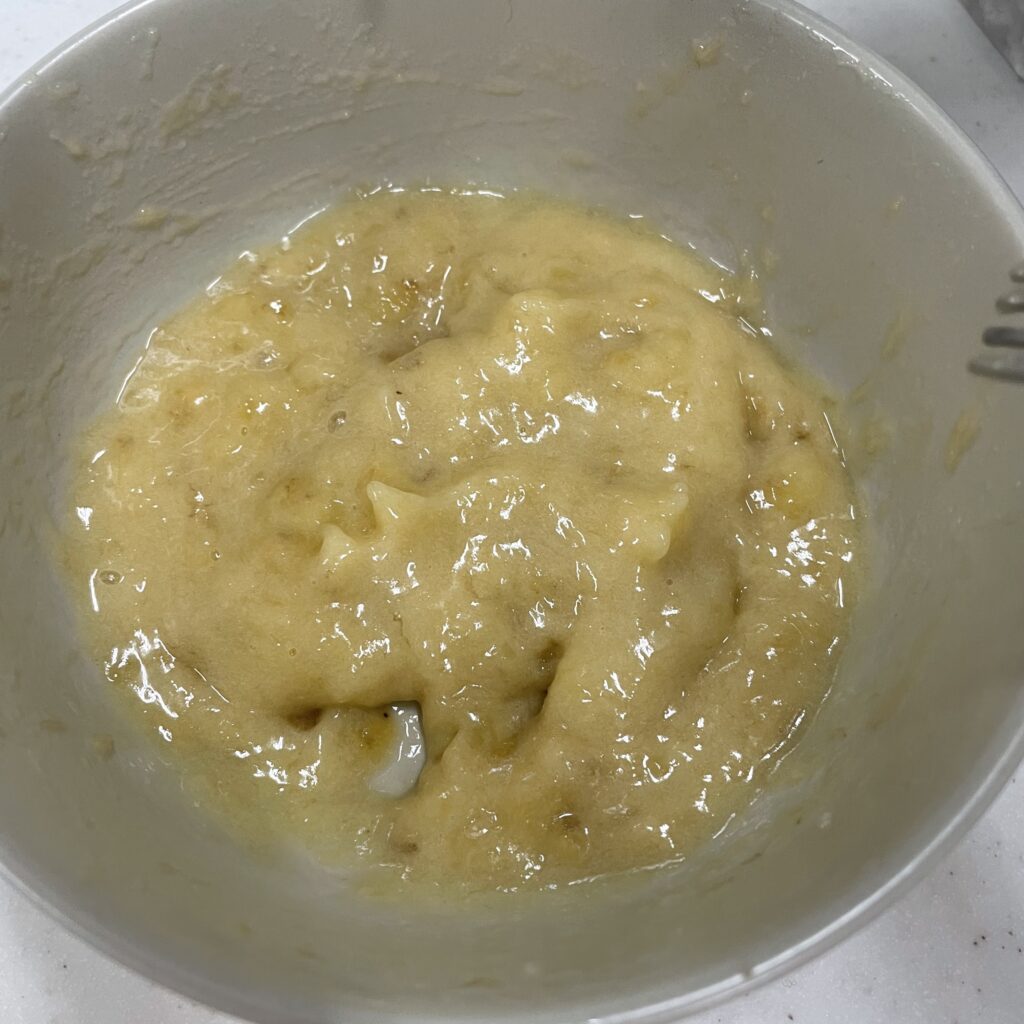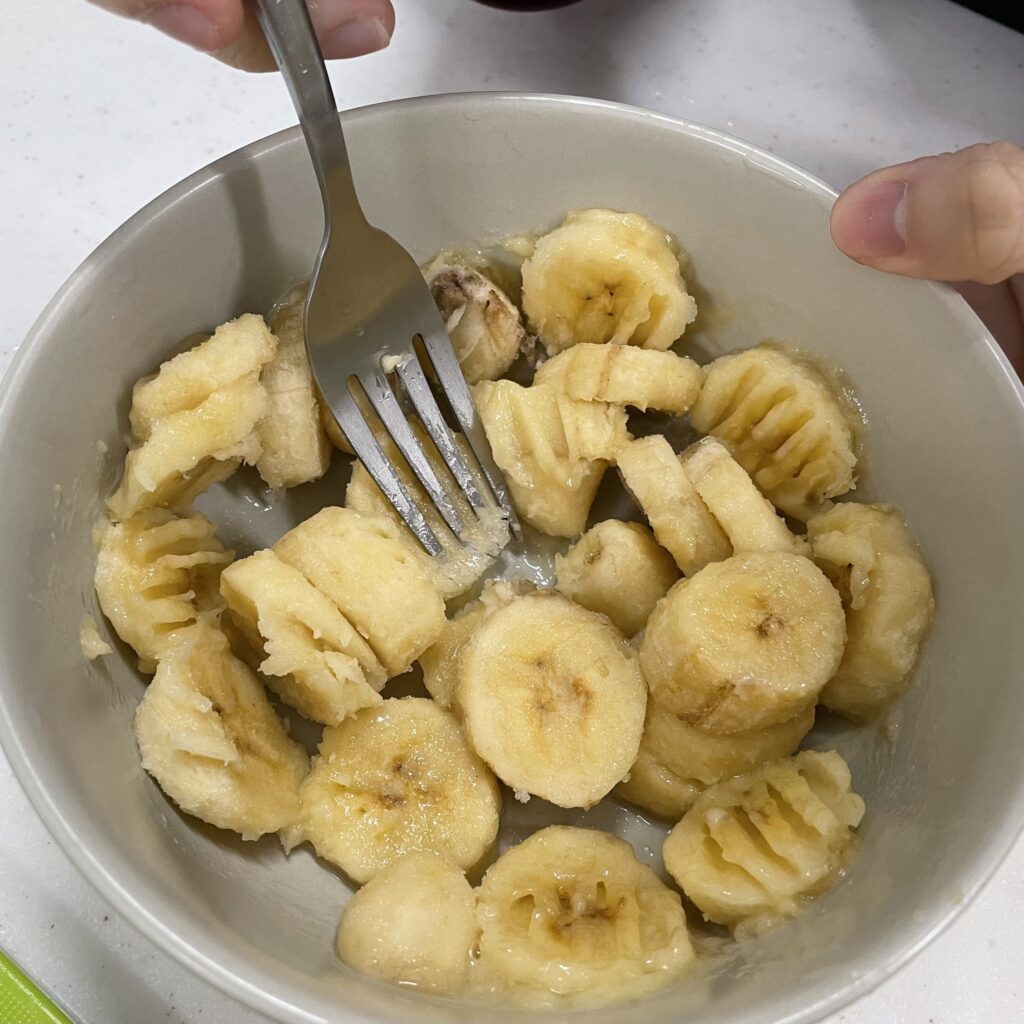 香蕉剝皮後切成一片片,放入碗中用叉子壓碎