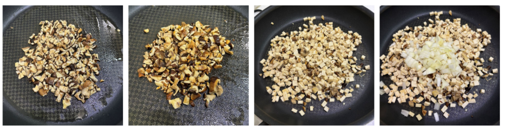 2. 鍋內放1.5大匙油,下香菇丁,用中小火煸到縮小變乾。