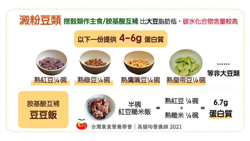 在台灣的營養學分類中,雖將黃豆、黑豆以外的所有豆類皆分類為「主食」,然而在世界許多國家,是把這些豆類分類在「蛋白質」家族喔!請參考美國USDA網站。