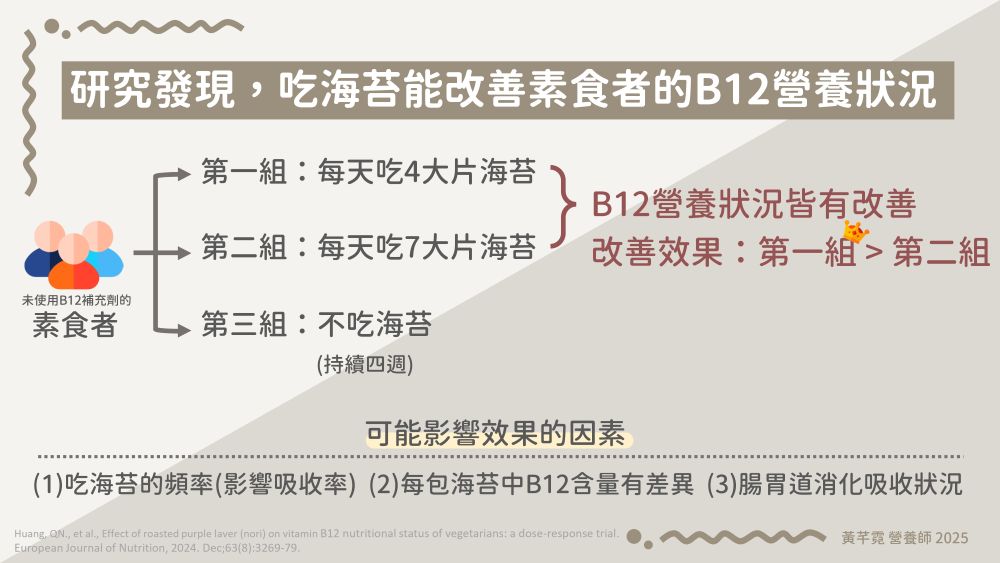 在這個研究中觀察到,吃最多海苔的組別,B12營養狀況改善效果並不是最好的,這可能是和攝取海苔的頻率、個人腸胃道消化吸收功能的不同有關(因為B12是非常依賴腸胃道功能進行吸收的),且雖然該研究中有發現,台灣常見市售無調味海苔中,幾乎都有一定程度的B12含量,但即使是同一個品牌的海苔,在不同季節購買時,當中的B12含量也有很大的差異,就像一般的食物一樣,紫菜中的B12可能會隨著產地、季節、生長環境、品種而有所不同。