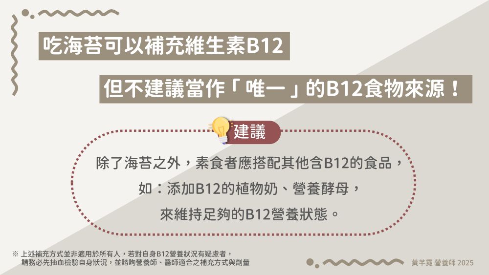 要滿足B12的每日建議攝取量需要長期每天吃相對大量的海苔,可能比較不符合一般飲食習慣,且每個人對海苔中B12的吸收率不同,因此建議還是需要搭配其他B12食物來源,例如:添加B12的植物奶、營養酵母。