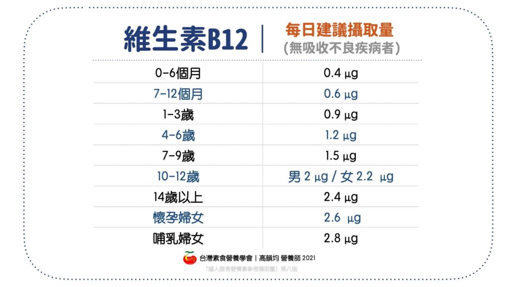 1-3歲: 0.9 microgram (微克) 10-12歲: 男 2 microgram (微克) / 女 2.2 microgram (微克) 哺乳婦女: 2.8 microgram (微克)