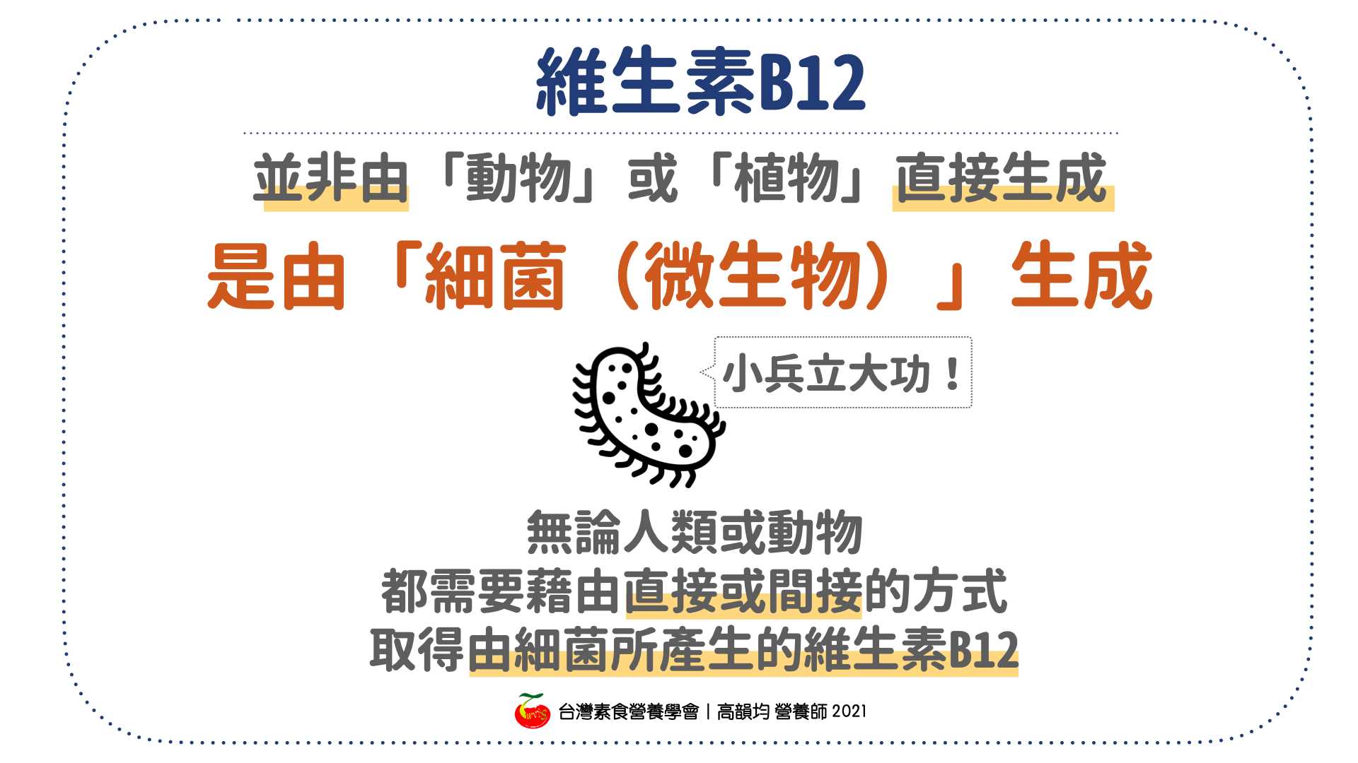維生素B12並非由動物或植物生成,是由【細菌(微生物)】生成。無論人類或動物,都需要藉由直接或間接的方式,取得由細菌所產生的維生素B12。