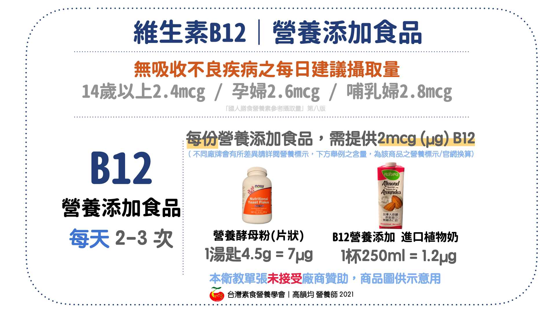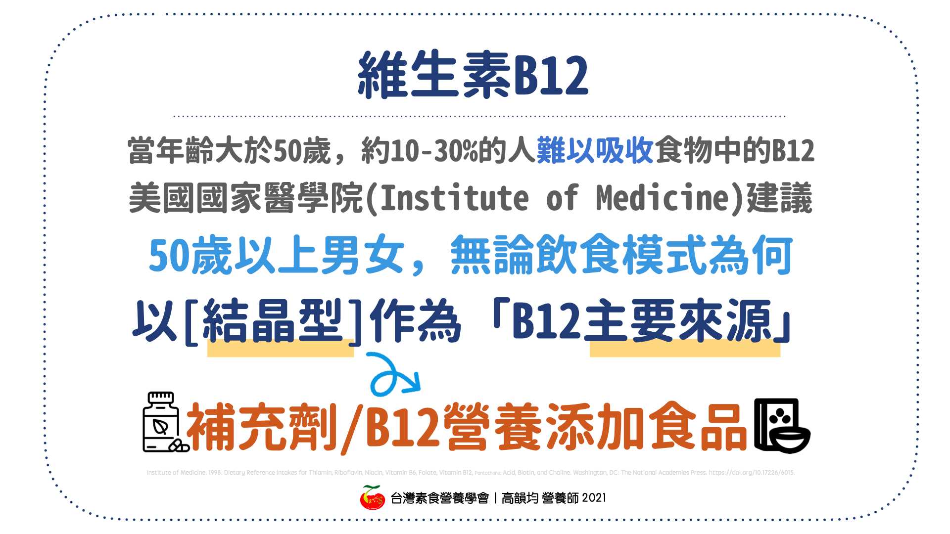 美國國家醫學院建議50歲以上男女,無論飲食模式為何,都需以補充劑或B12營養添加食品作為可靠的B12來源。