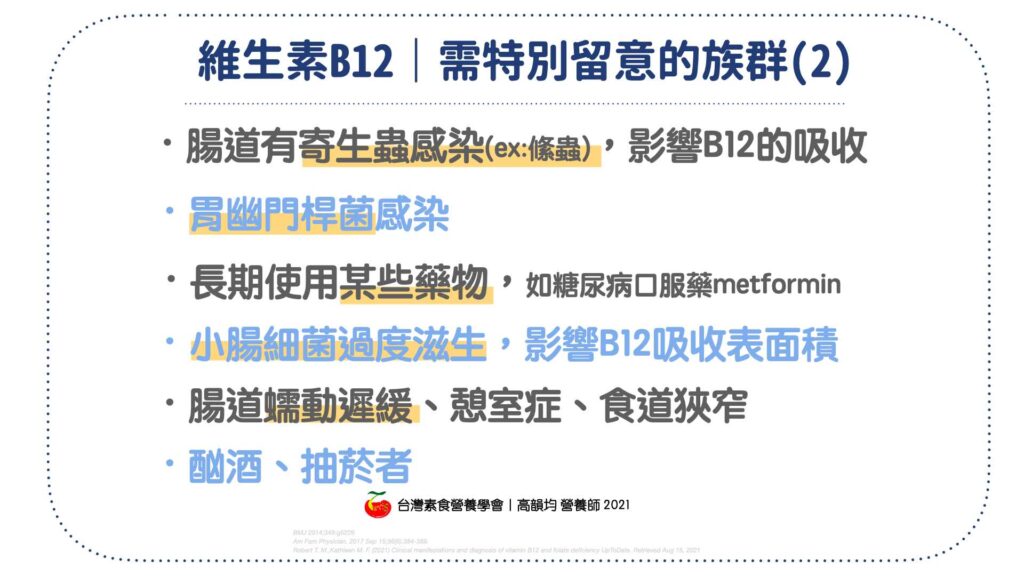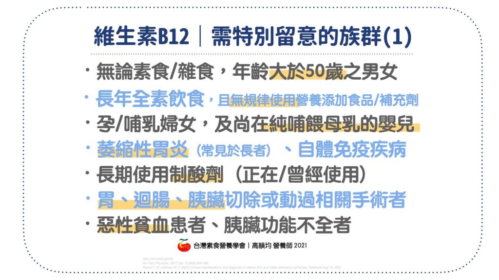 – 長期全年素食者                     – 自體免疫疾病患者                    – 寄生蟲感染者 – 小腸細菌過度孳生者 – 惡性貧血、胰臟   功能不全者