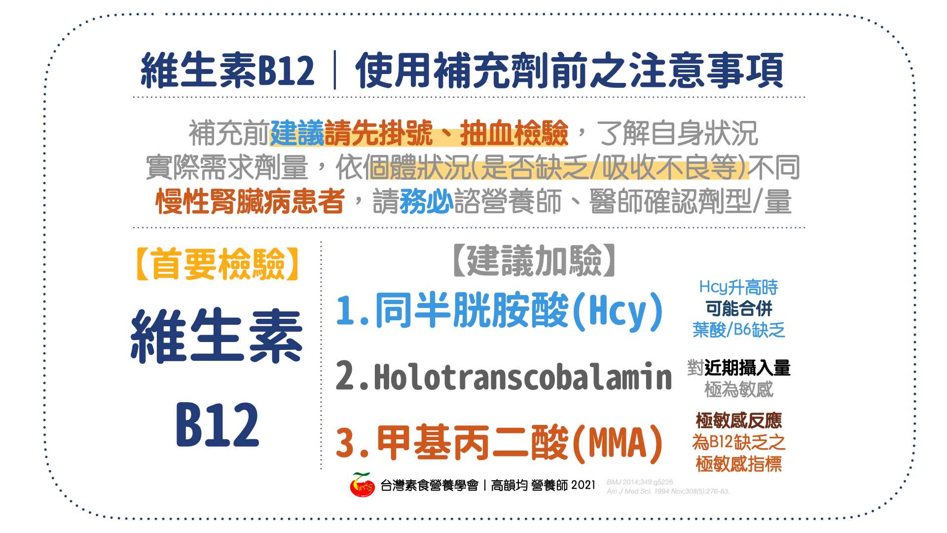 對自身B12攝取狀況有疑慮者,建議掛號抽血檢驗,嚴重缺乏者,應向醫師、營養師確認劑量。