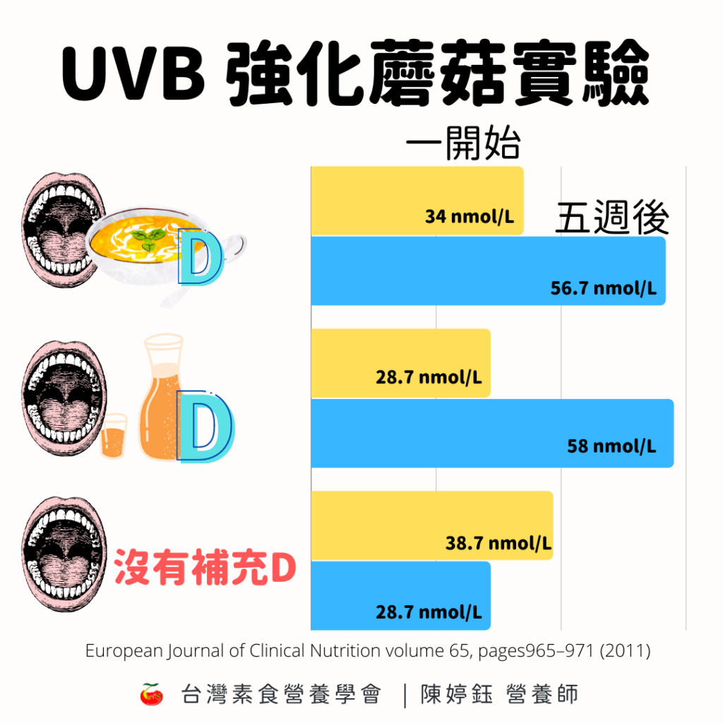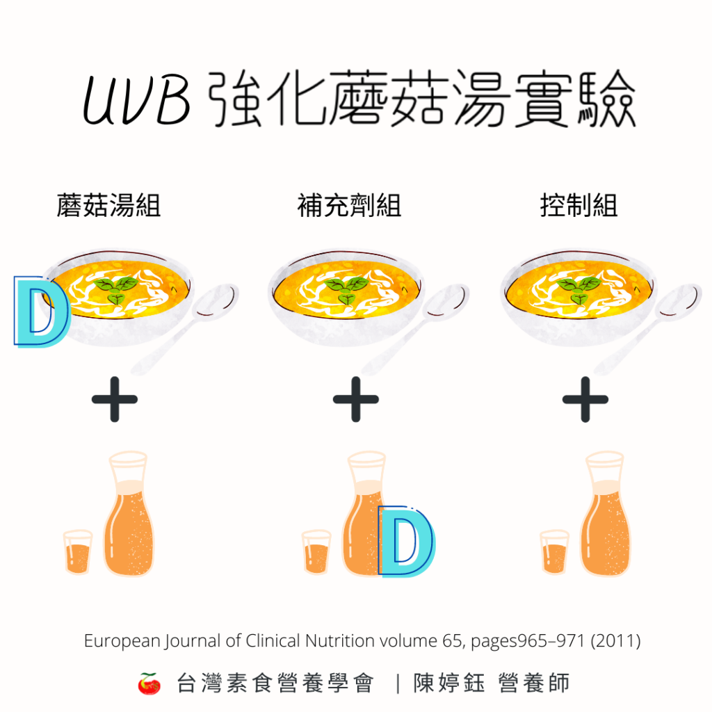 另一個歐洲的研究,則使用UVB燈泡 (波長: 306nm) 照射新鮮的棕色蘑菇 (fresh brown button mushrooms),兩面照射各25分鐘,然後做成蘑菇湯。這項研究中的26位受試者,平均體內的25(OH)D濃度都低於50nmol/l。其中8位被隨機分配到 蘑菇湯組 (每週喝一碗含28000IU維生素D2的蘑菇湯以及一杯不含維生素D2 的柳橙汁當作安慰劑),另外9位到補充劑組 (每週喝一杯含有28000IU維生素D2的柳橙汁以及含微量維生素D2的蘑菇湯當作安慰劑) ,最後9位被分配到 控制組 (每週喝一杯不含維生素D2 的柳橙汁以及含微量維生素D2的蘑菇湯)。五個禮拜後,蘑菇湯組的血清維生素D2 從平均34nmol/L提升到56.7nmol/L,補充劑組從28.7nmol/L提升到58nmol/L,控制組的血清維生素D濃度沒有提升。也就是說,以UVB強化的蘑菇跟補充劑效果是差不多的。